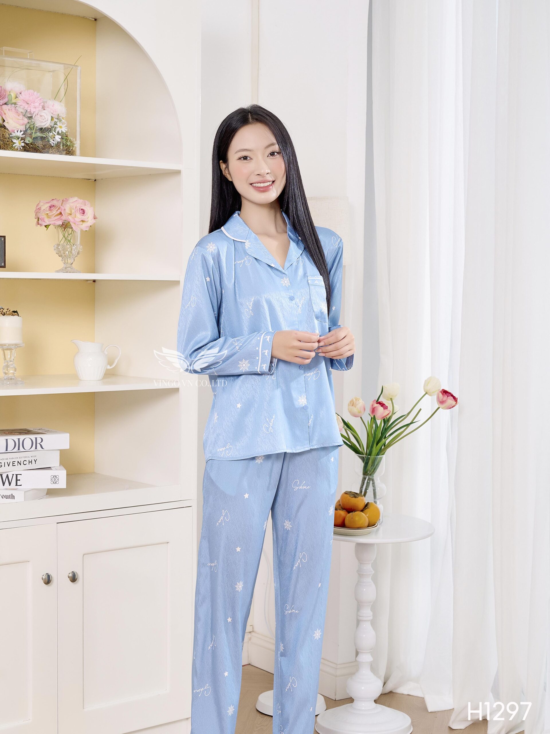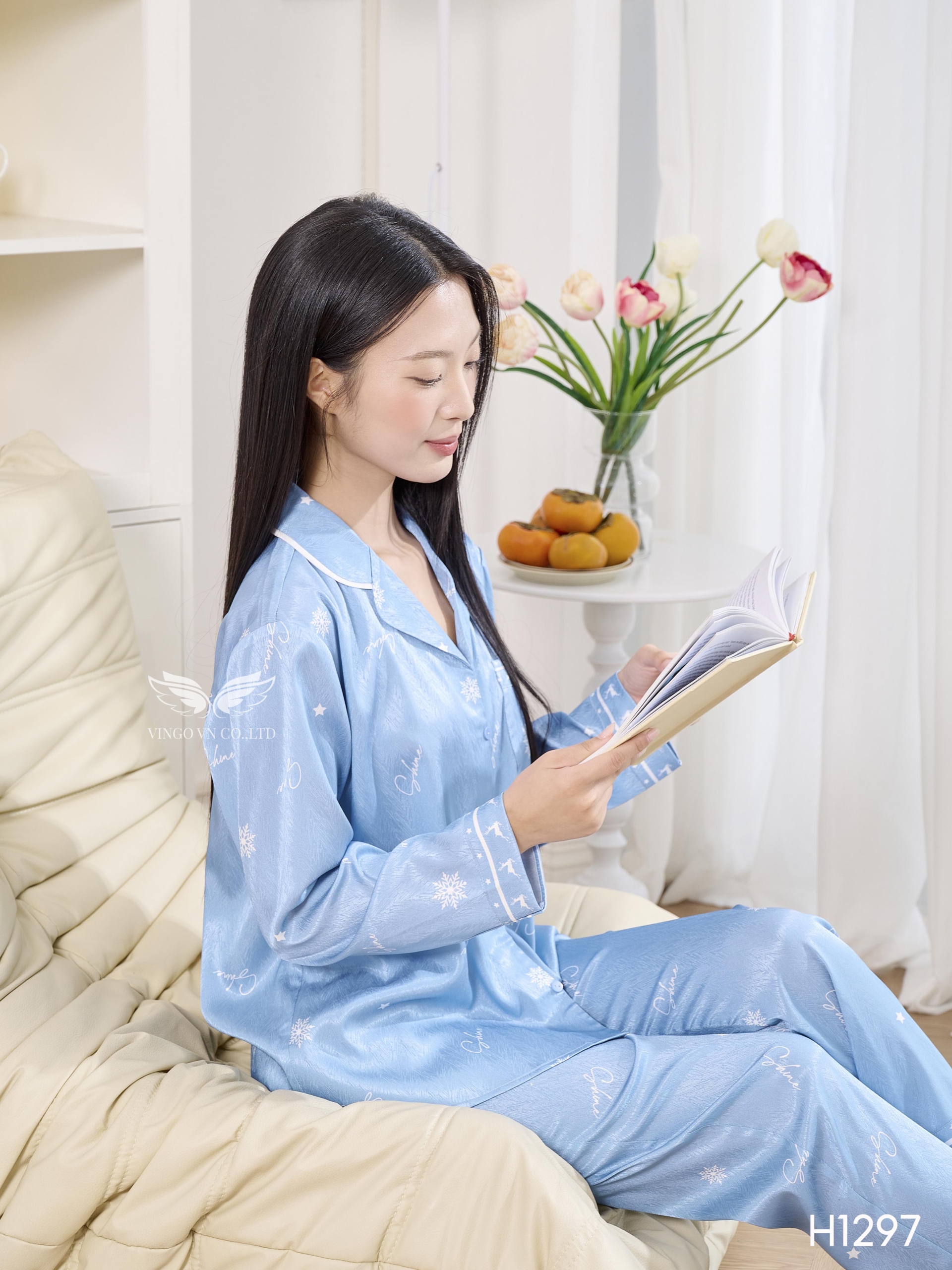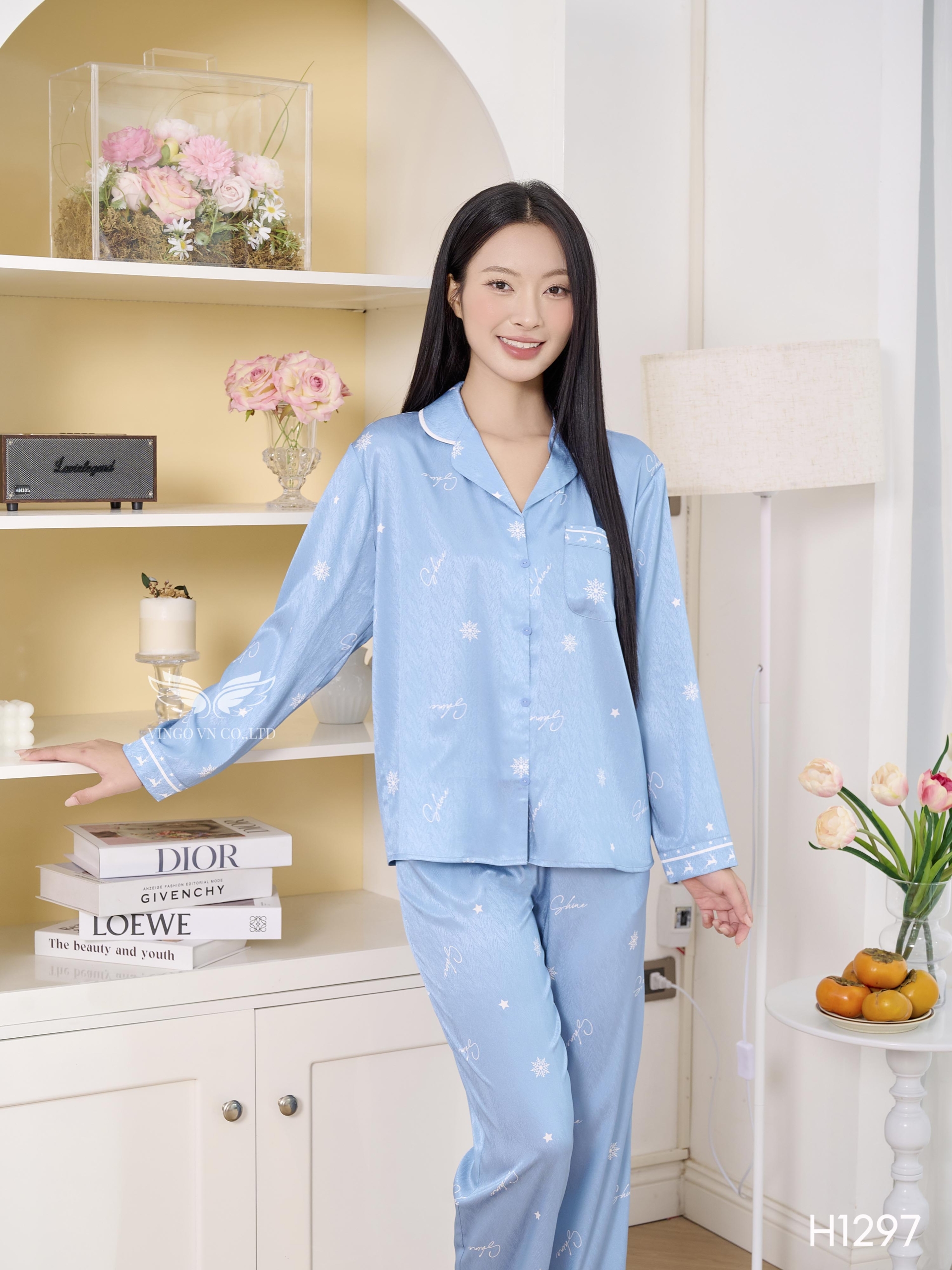 – Set pijama lụa H1297 từ Vingo có thiết kế tay dài dáng có chiết eo nhẹ giúp vóc dáng thon gọn hơn.