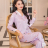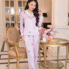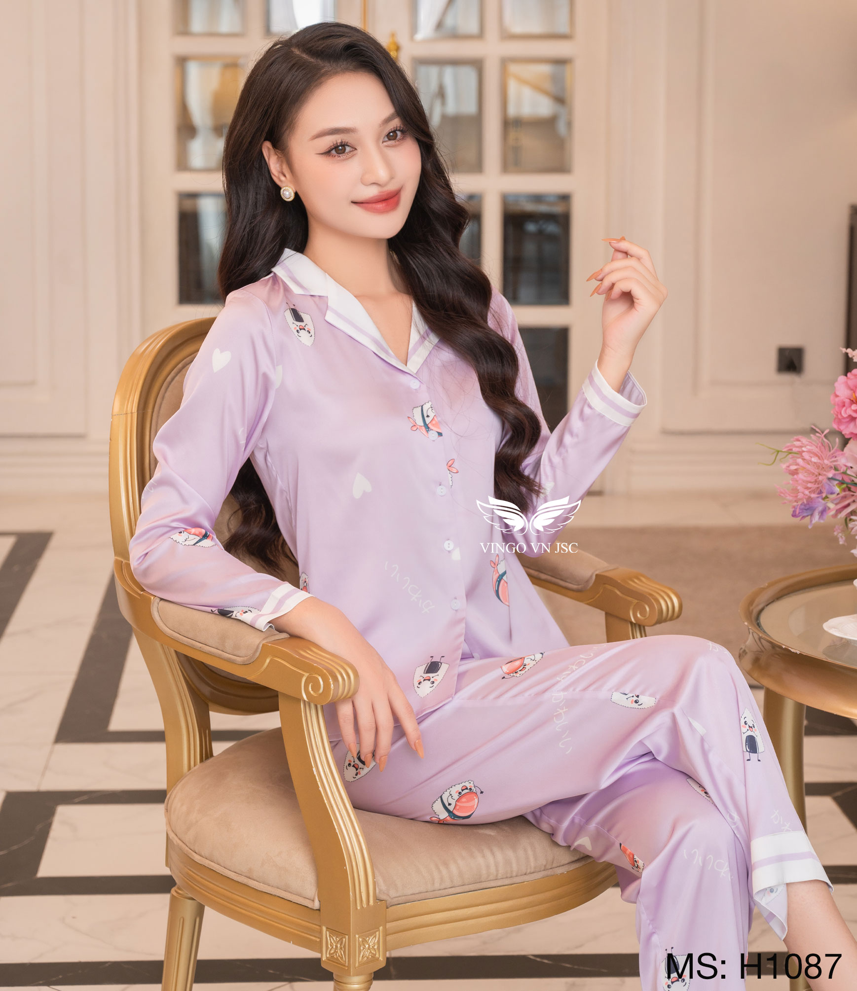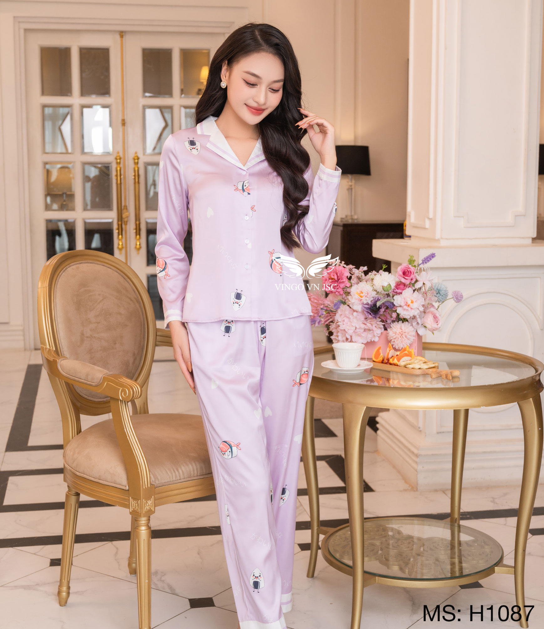 Bộ đồ ngủ pijama lụa tay dài quần dài màu tím nhạt hoạ tiết dễ thương H1087