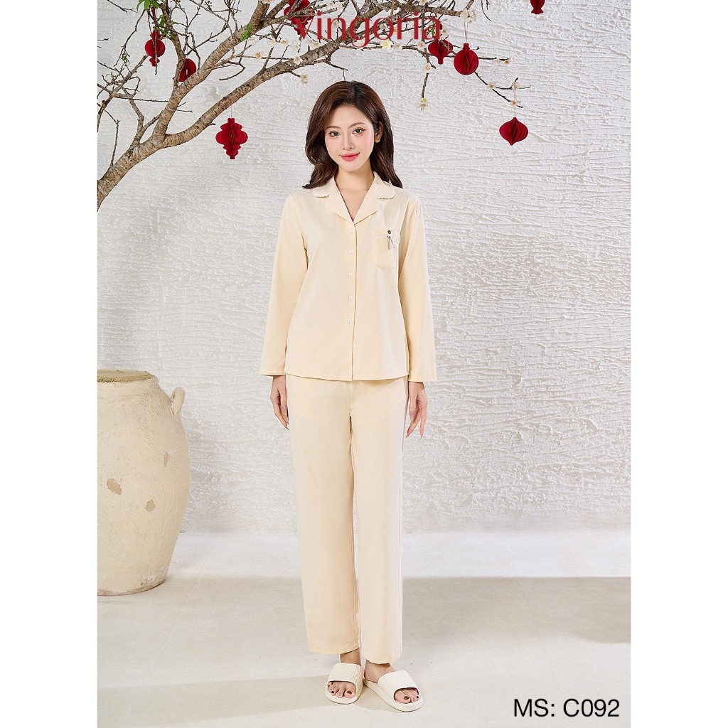 Bộ Pijama cotton tay dài quần dài dáng suông, phối ren C092