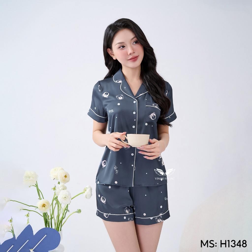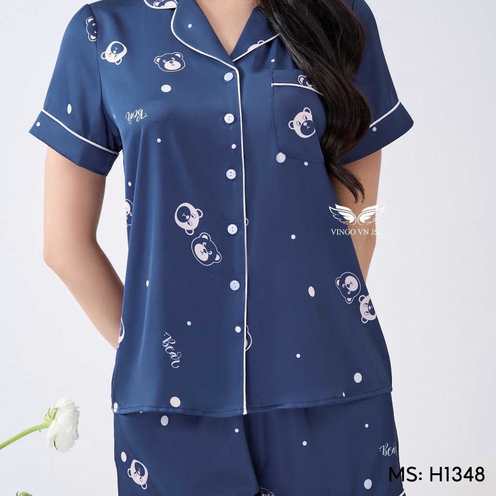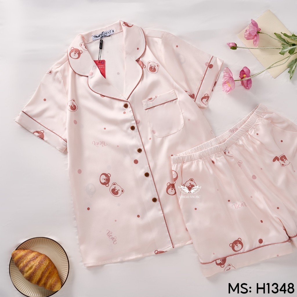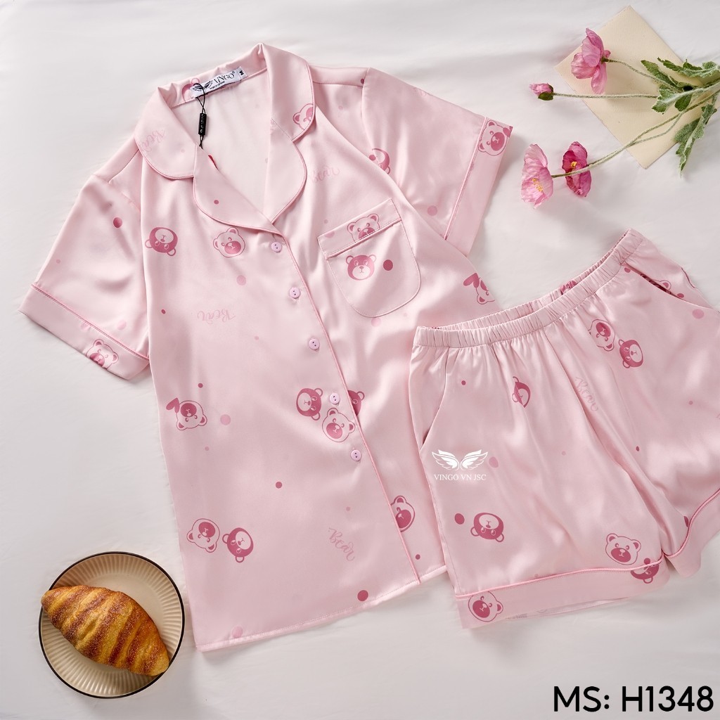 – Bộ Pijama lụa tay cộc quần cộc họa tiết gấu H1348 từ VINGO/VINGORIA có thiết kế dáng áo có chiết eo nhẹ vừa trẻ trung vừa sang trọng.