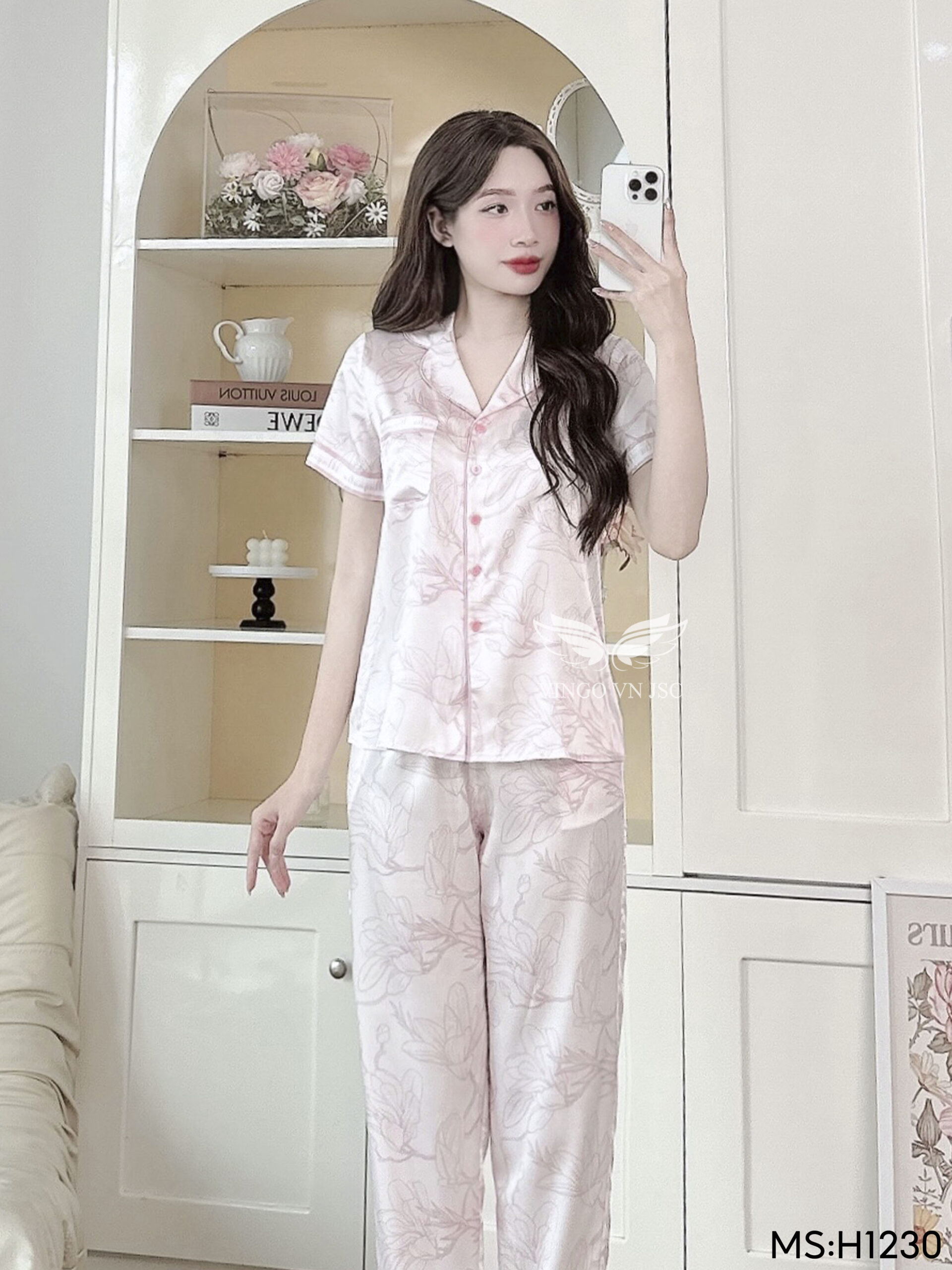 • Tên sản phẩm: Đồ bộ mặc nhà lụa cao cấp tay cộc quần dài họa tiết hoa mộc lan H1230