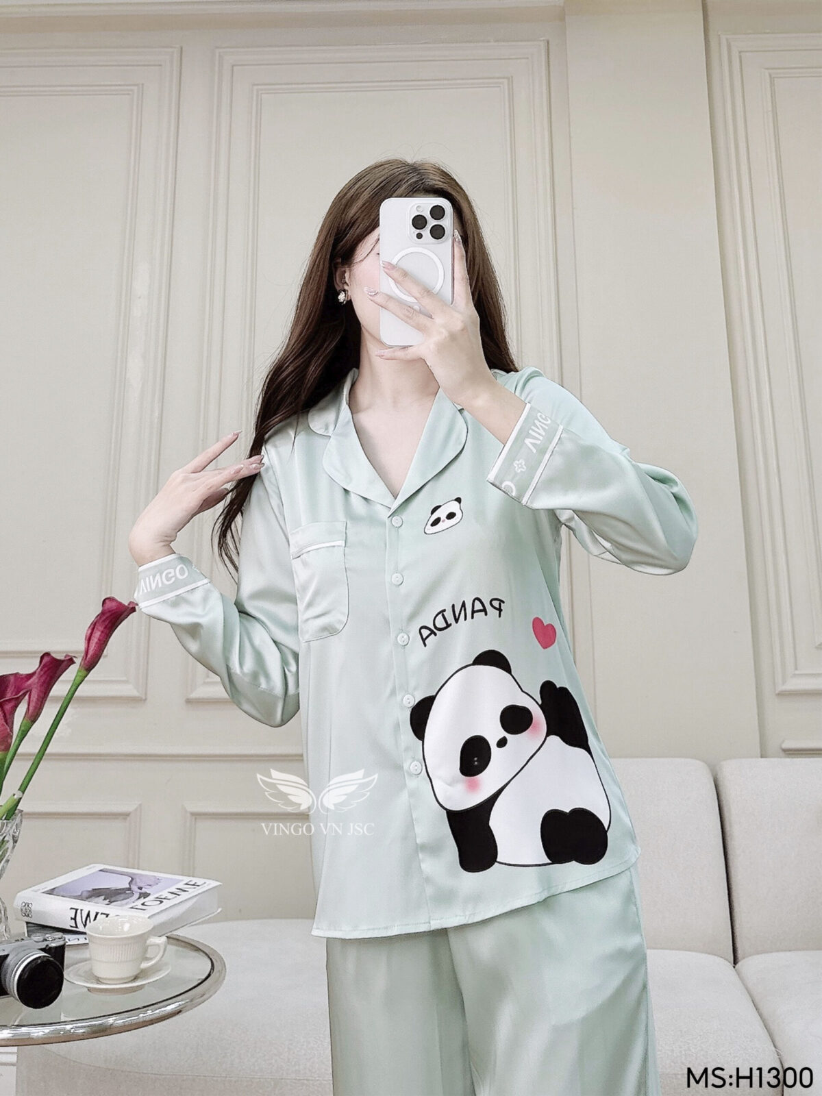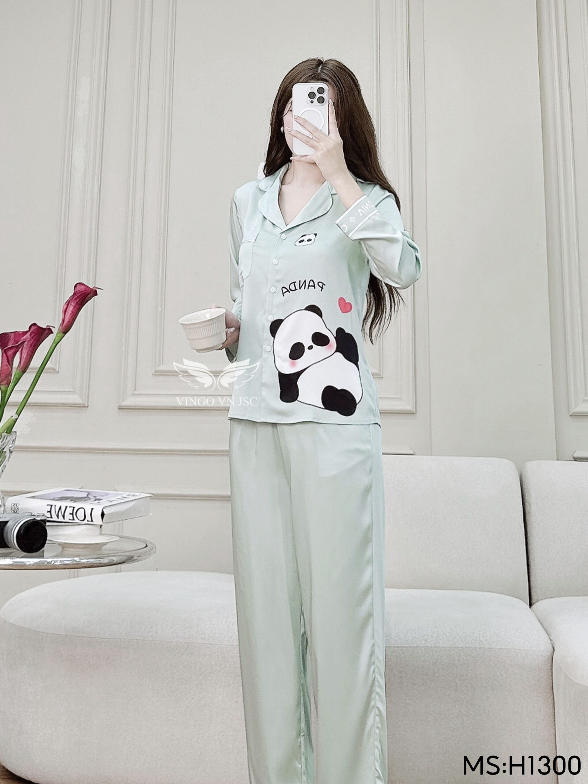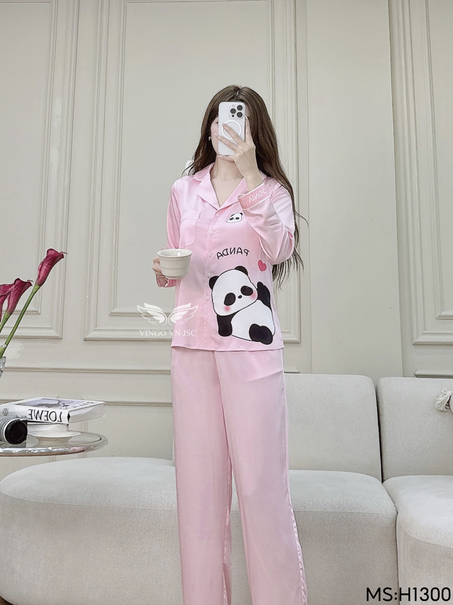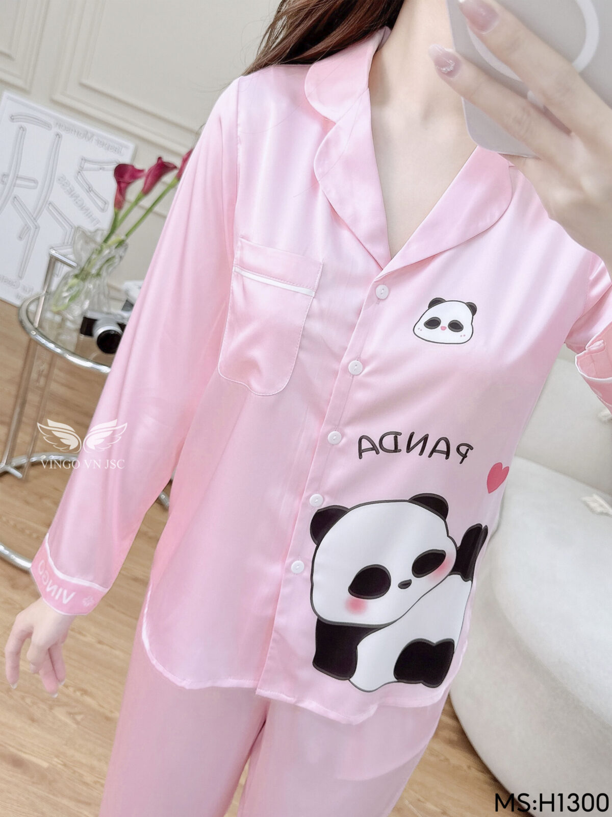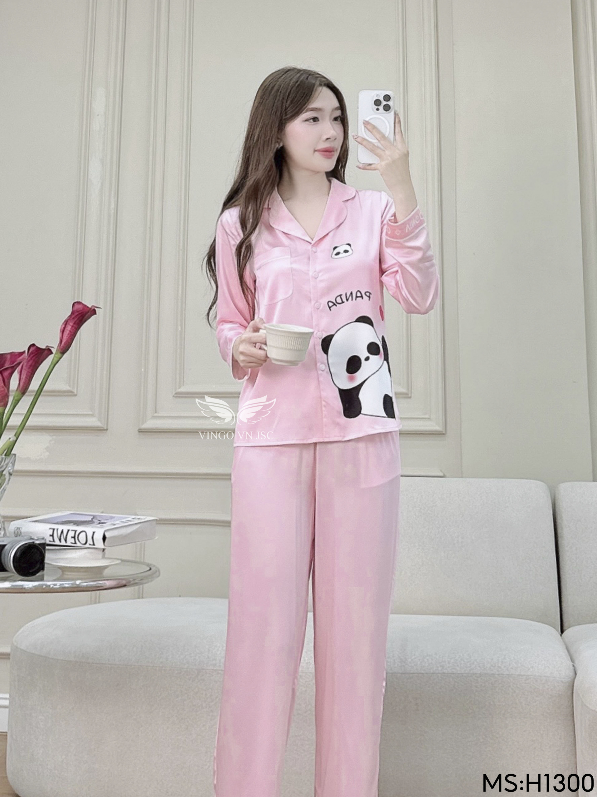 - Tên sản phẩm: Đồ bộ mặc nhà pijama lụa cao cấp tay dài quần dài họa tiết Panda dễ thương H1300