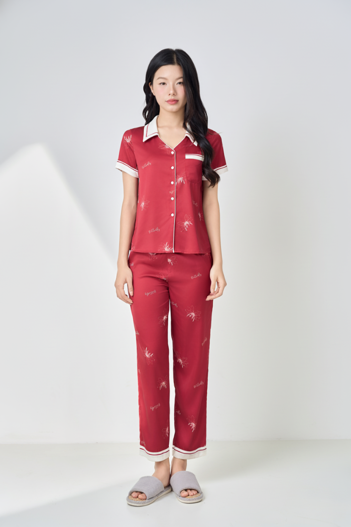 – Họa tiết cánh bướm trên nền đỏ mang đến hình ảnh vừa bay bổng vừa mạnh mẽ, tượng trưng cho sự chuyển hóa, tái sinh và vẻ đẹp tự do