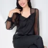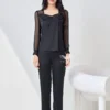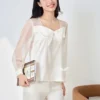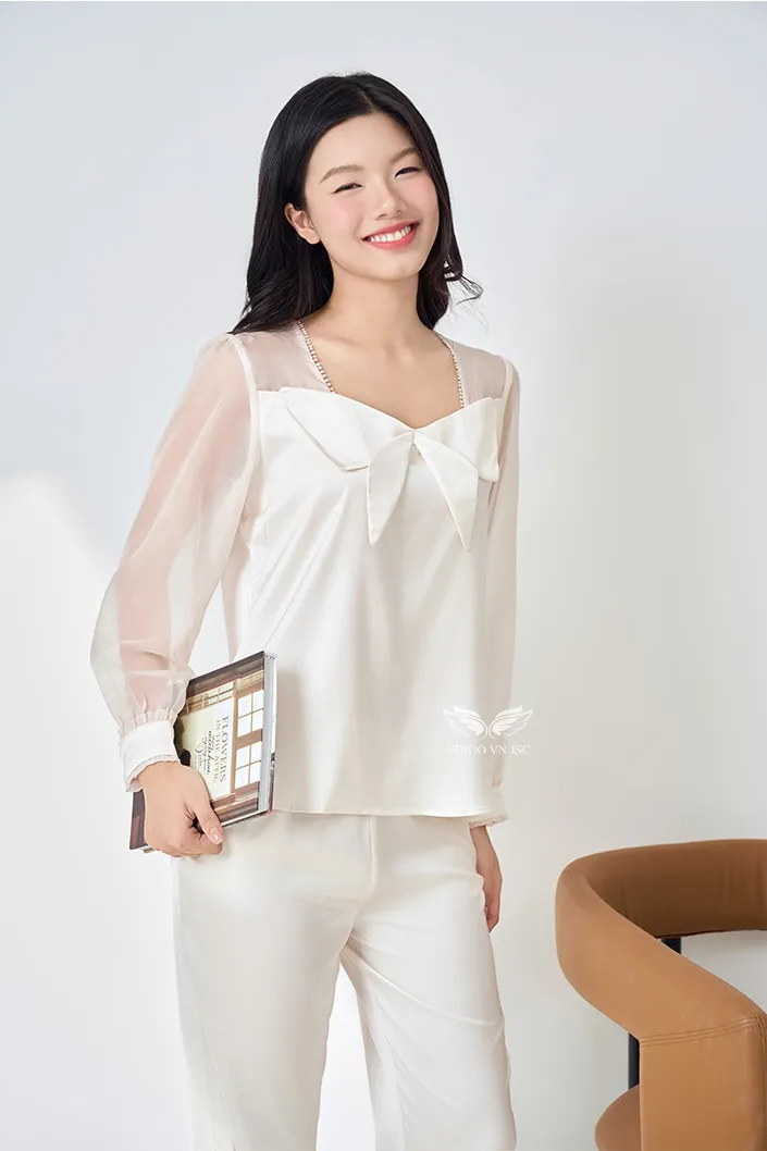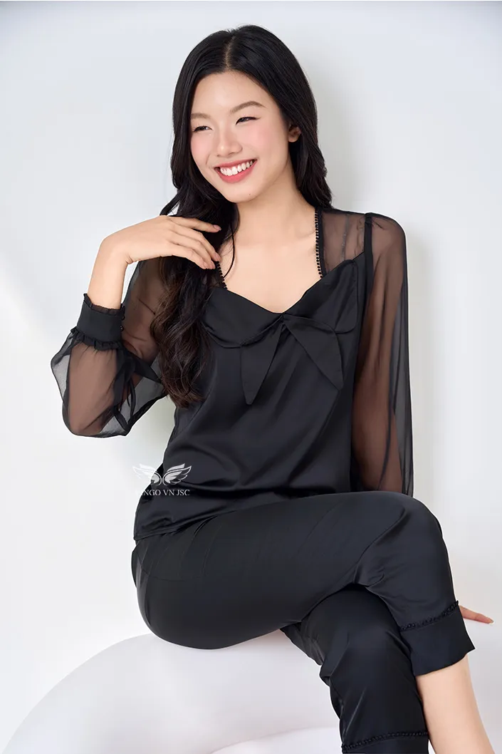 – Tay áo may bằng chất liệu voan xuyên thấu, bo viền ở cổ tay tạo sự tinh tế và sang trọng