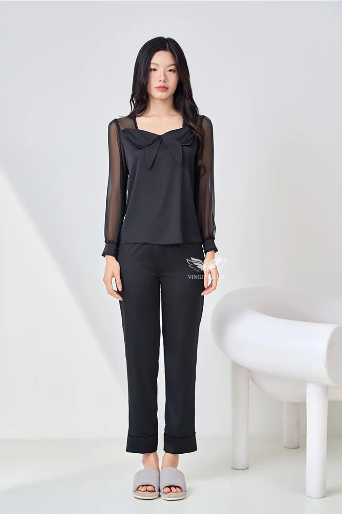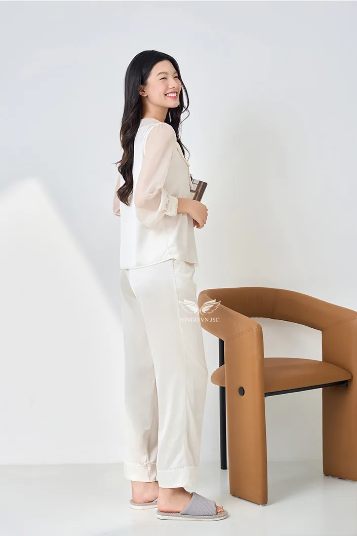 – Set pijama lụa H1442 từ Vingo có thiết kế tay dài dáng suông nhẹ giúp vóc dáng thon gọn hơn.