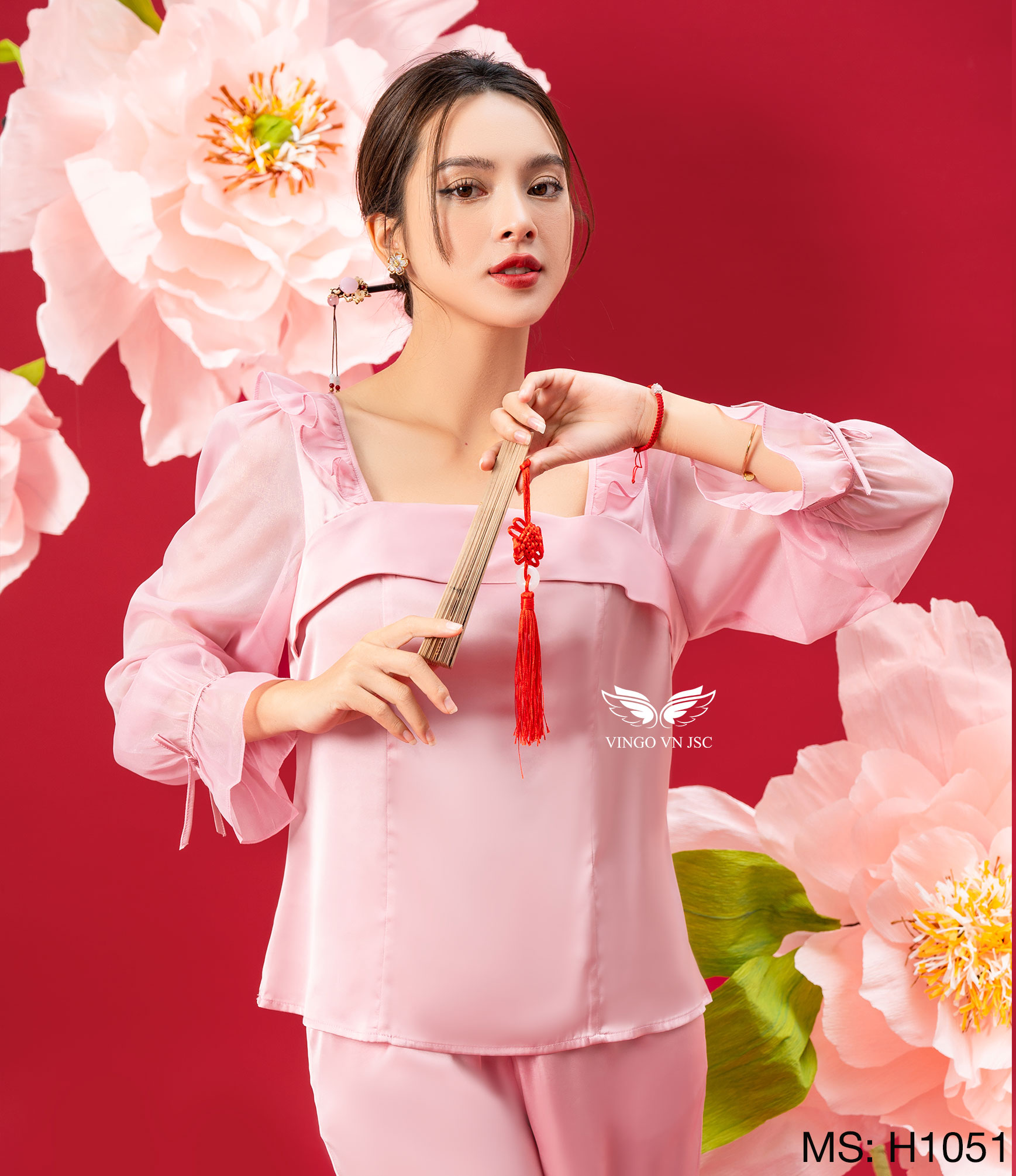 – Set pijama lụa H1051 từ Vingo có thiết kế tay dài quần dài eo giúp vóc dáng thon gọn hơn.