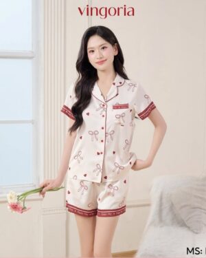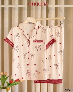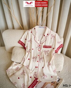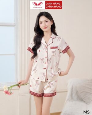 Bộ Pijama lụa tay cộc quần cộc họa tiết nơ H1412