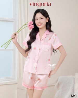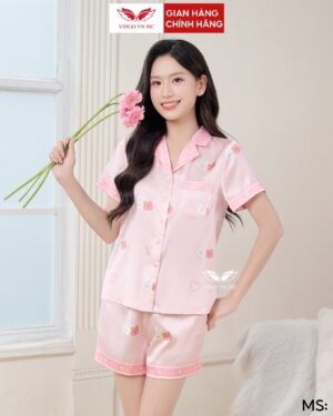 Bộ Pijama lụa tay cộc quần dài họa tiết gấu nhỏ H1476