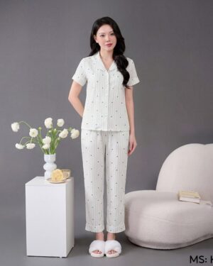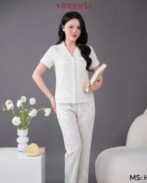 Bộ Pijama đũi tay cộc quần dài dáng suông họa tiết kẻ trái tim H1531