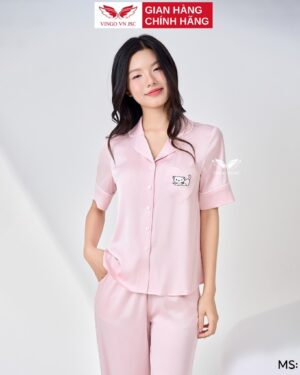 Bộ Pijama lụa tay cộc quần dài túi thêu mèo nhỏ dễ thương H1489