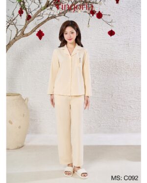 Bộ Pijama cotton tay dài quần dài dáng suông, phối ren C092