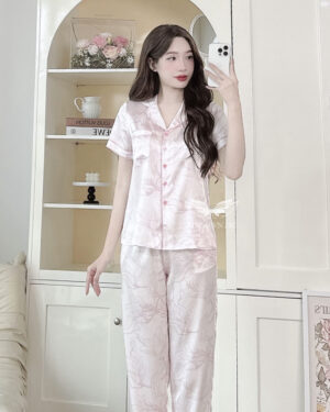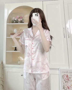 Đồ bộ mặc nhà lụa cao cấp tay cộc quần dài họa tiết hoa mộc lan H1230